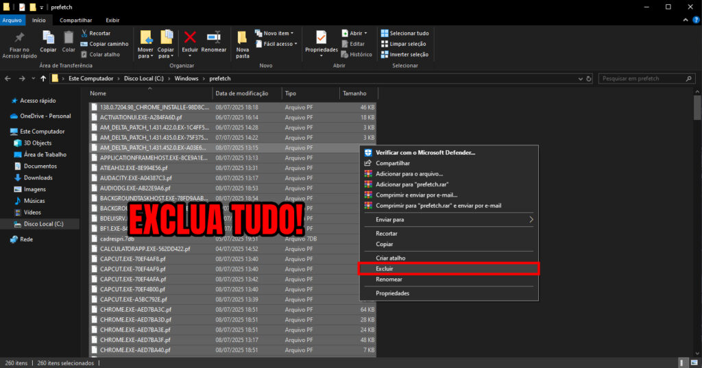 Ctrl + Apara selecionar todos os arquivos e depoisDelete. - Marque a caixinha “Fazer isso para todos os itens atuais” e clique em Ignorar para os que não puderem ser excluídos.