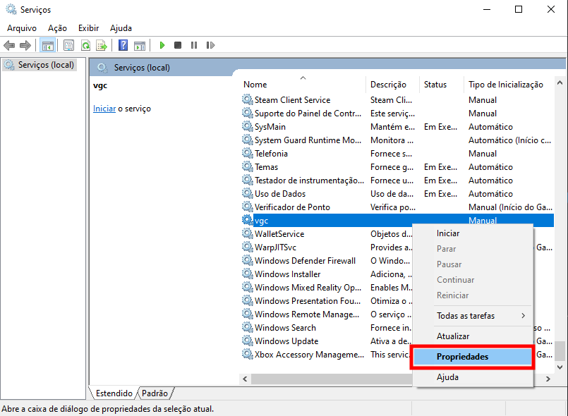 - Clique com o botão direito em vgc e selecione Propriedades.