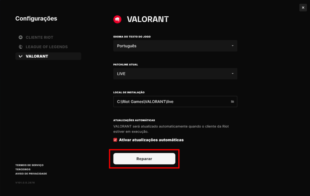 O Cliente Riot possui uma ferramenta integrada para corrigir problemas de instalação e arquivos corrompidos.