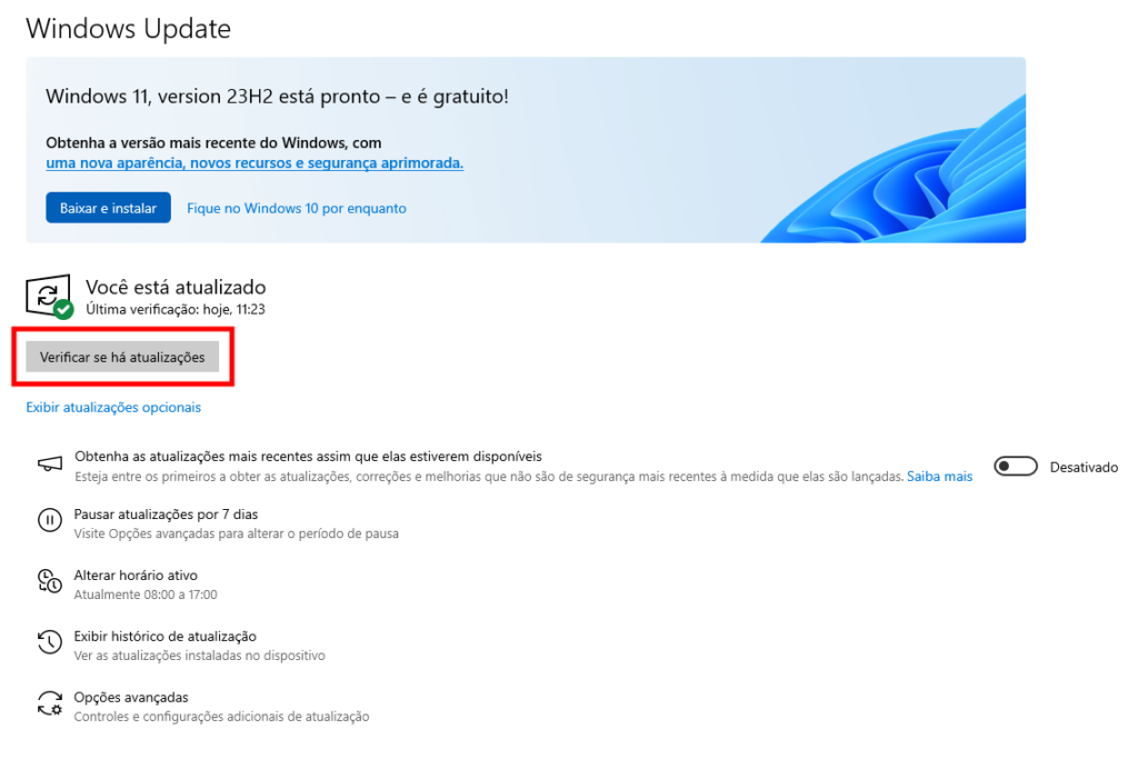 - No menu iniciar, vá em Configurações > Atualização e Segurança > Windows Update.