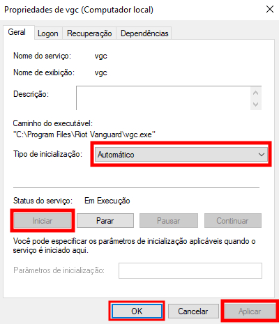 - Em Tipo de Inicialização, altere de Manual para Automático.